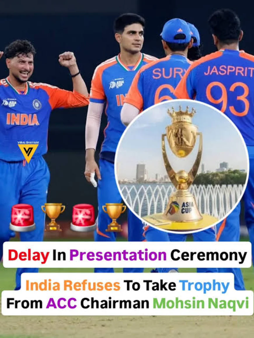 After India defeated Pakistan in the Asia Cup 2025 final, the post-match trophy presentation was cancelled in part — the Indian team refused to accept the trophy from ACC Chairman & Pakistan minister Mohsin Naqvi. What followed was a highly unusual, tense moment: significant delays, mixed messages, and a formal protest by the BCCI.