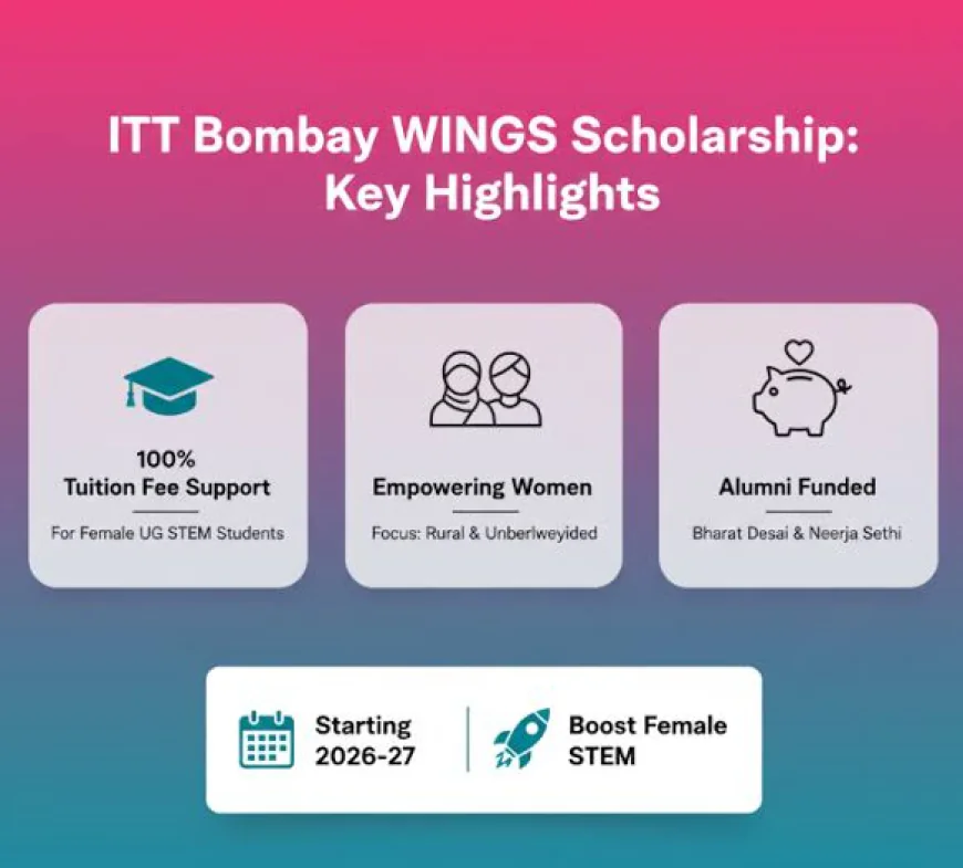 IIT Bombay has announced its ‘WINGS’ scholarship program, a landmark initiative to provide 100% tuition fee support for women pursuing undergraduate courses in Science, Technology, Engineering, and Mathematics (STEM) starting from the 2026-27 academic session. The program aims to bridge the gender gap in STEM education and inspire young women to take leadership roles in innovation and research.