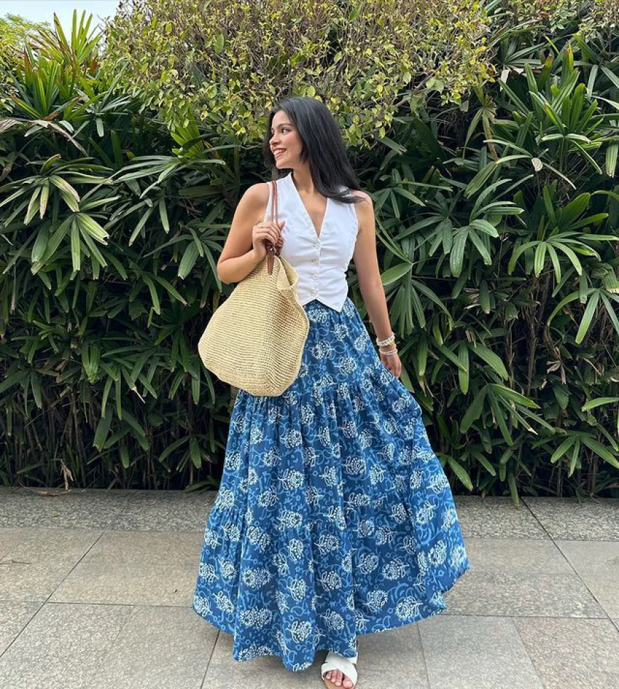 Channel those meadow vibes with a kalamkari or ikat print midi skirt. Pair it with a tucked-in cotton blouse or even a button-down shirt with puff sleeves. Add a cloth belt or jute tote to tie it all together. Perfect for college fests or casual days when you want to feel extra cute.