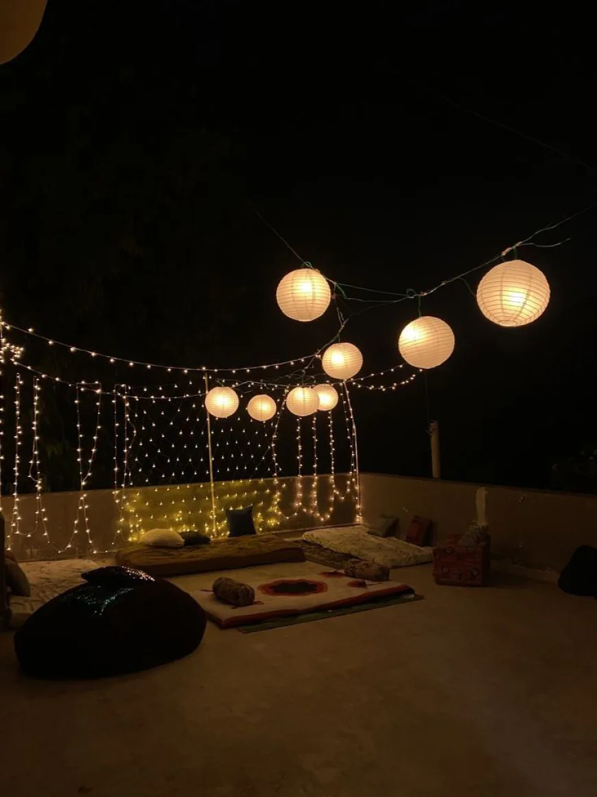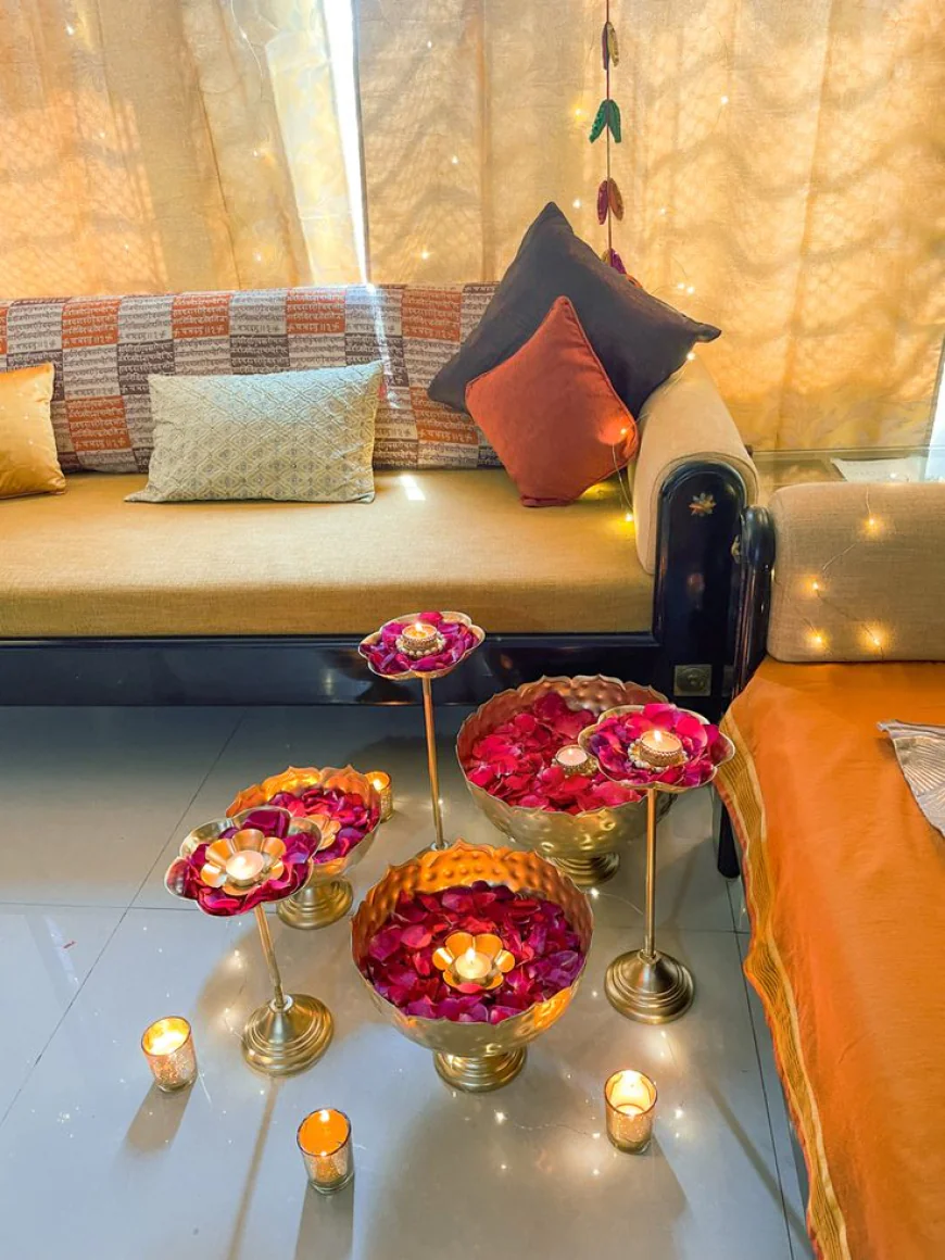 Fairy lights, diyas, and fresh flowers are your best friends. Add a statement corner with rangoli or a photo backdrop so people have a place to click their Instagram stories. Pro tip: dim the main lights and let the warm glow of diyas and fairy lights set the vibe as it instantly hides any last-minute cleaning disasters.